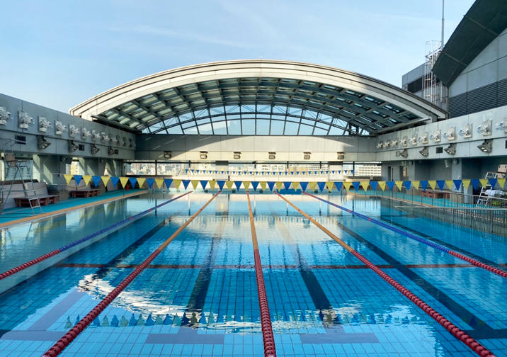 25m×6コースの天窓のある開放的な屋上温水プールです。