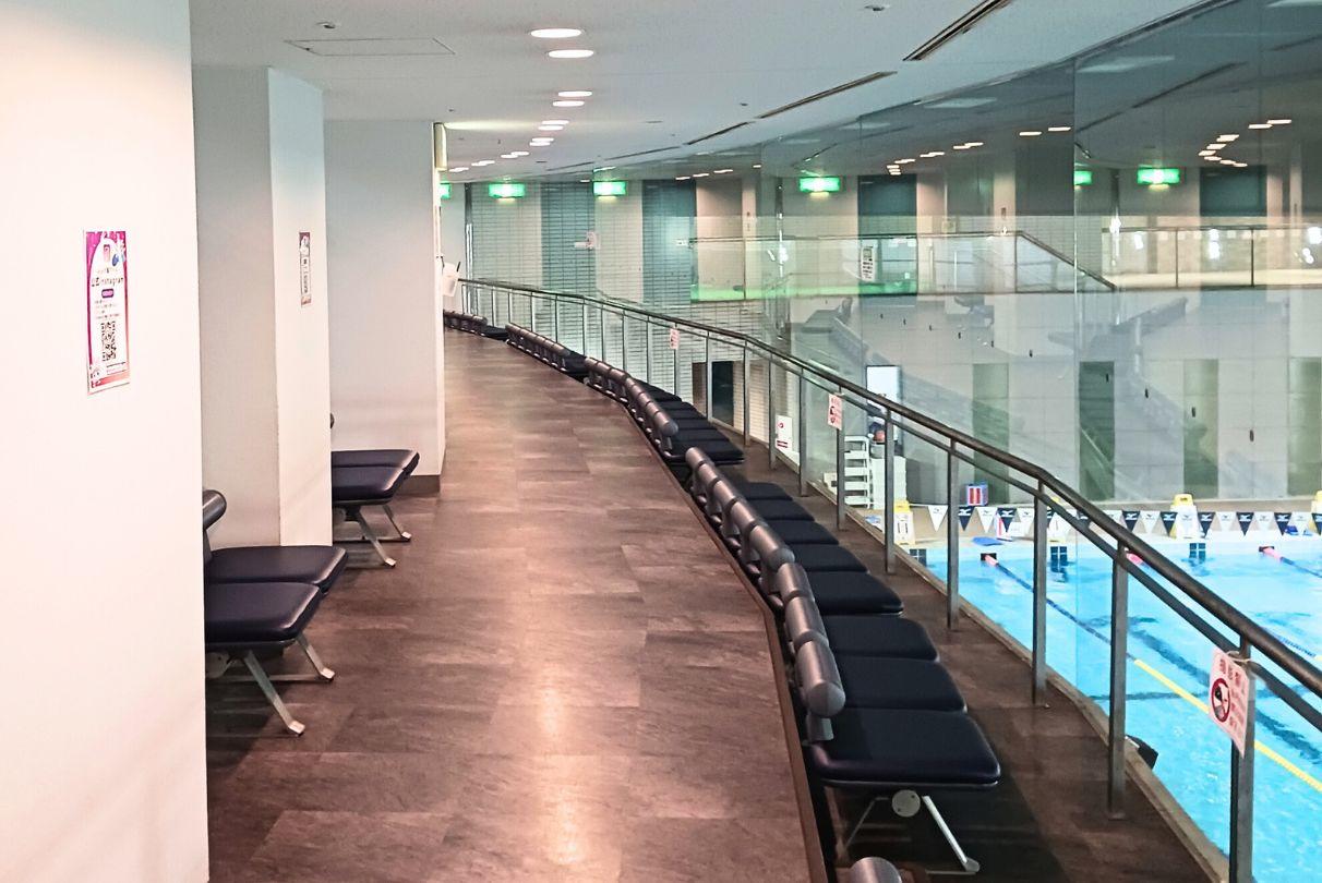 観覧スペースからはプール全体をご覧いただけます。スクールレッスンの見学などにご利用いただけます。