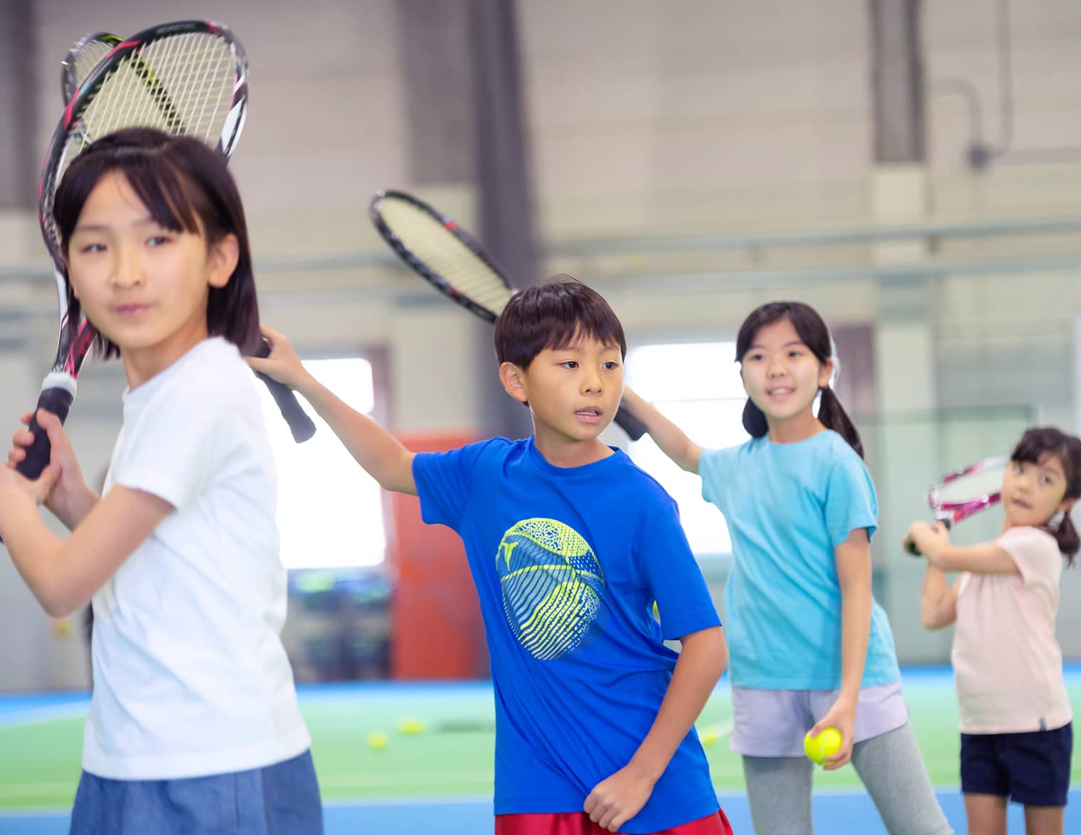 I.T.F(国際テニス連盟)が子供たちの年齢に応じて定めたPLAY+STAYプログラムを採用することで、すぐにゲームを楽しめて、よりスムーズにレベルアップしていただけます。