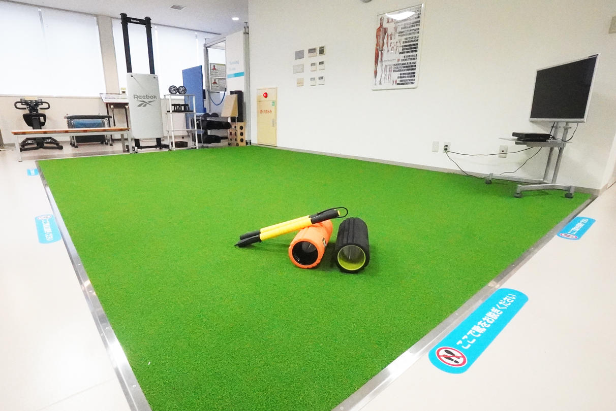 開放的な人工芝の上で立つ、座る、歩く、ジャンプするなどカラダの基本動作をより効率的におこない「動くカラダ」をつくるエリアです。