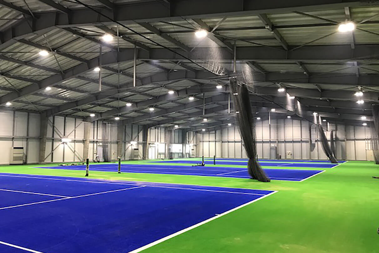 冷暖房完備のインドアコート専用人工芝コート4面。雨の日でも快適にプレーを楽しんでいただけます。
