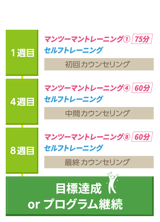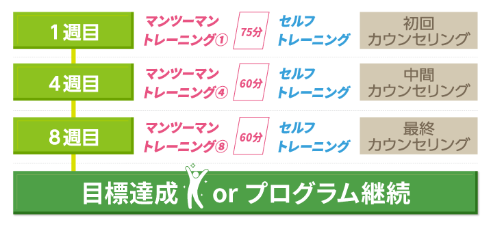 あなたの専属のトレーナーによる週に1度のマンツーマントレーニングとセルフトレーニング、また3度のカウンセリングにより、理想の体型に近づけることを目的としたプログラムです。