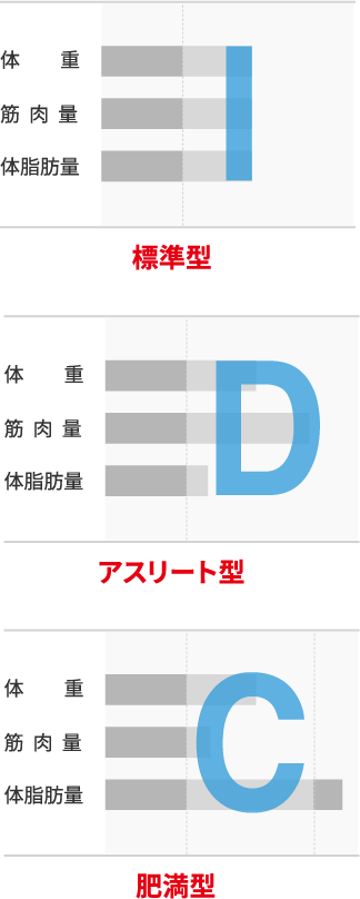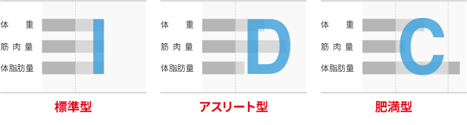 体重・筋肉量・体脂肪量であなたの体型タイプを確認することができます。