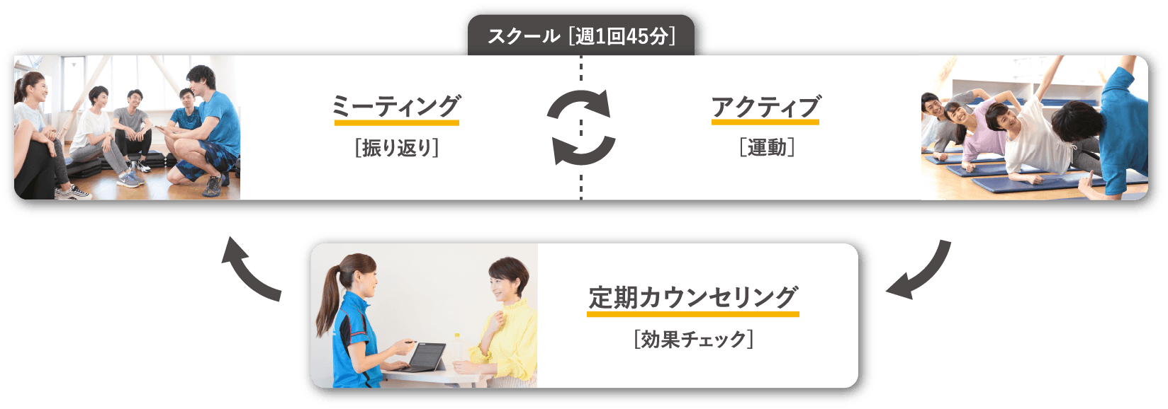 週に1回のスクールでは、運動前に担当のスタッフとお客さま同士で、目標に対する1週間の振り返りをいたします。運動への興味や意識が高まります。